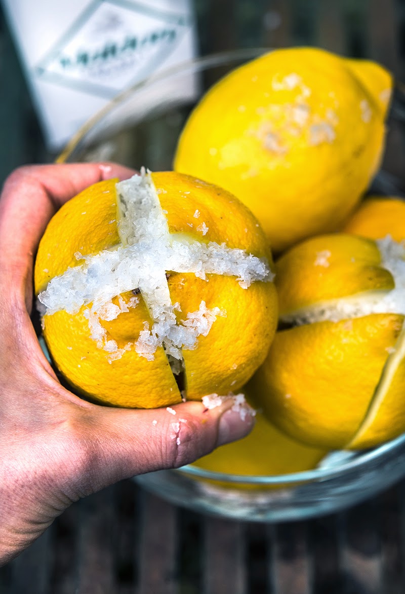 Slice the lemons, lengthwise, in quarters, leaving one end intact.  Then, stuff them with a good amount of sea salt (like Maldon)…