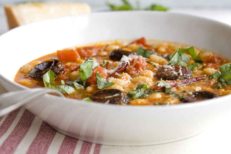 From there, it’s pretty much a one-pot meal, a dish you can prepare in advance and one that actually tastes even better the next day. Start by sauteing chorizo or pancetta in a pan, then remove, and set aside. The tasty drippings from the chorizo or pancetta are then used to flavor the sofrito and beans. I like the beans with a good amount of broth — so that it’s sort of a cross between a soup and a stew. The tomatoes and basil (both grown hydroponically this time of year) and rosemary add a nice fresh component. The dried chiles and smoked paprika lend a a whisper of heat. All and all, an ideal meal for a cold, winter’s night.