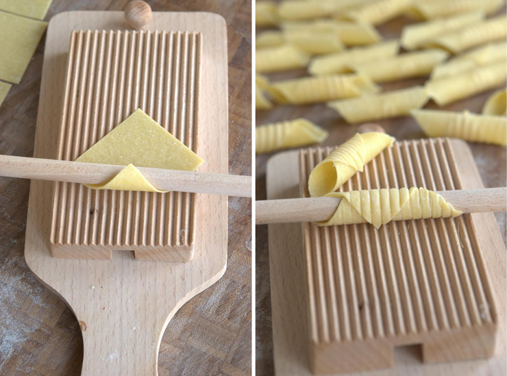 Cut the dough into 1 1/2-inch squares.  Using a dowel or pencil, roll the pasta square on the gnocchi board, as pictured above, until you form a tube.  Repeat with the remaining dough (place the garganelli in a single layer so they don’t stick together).