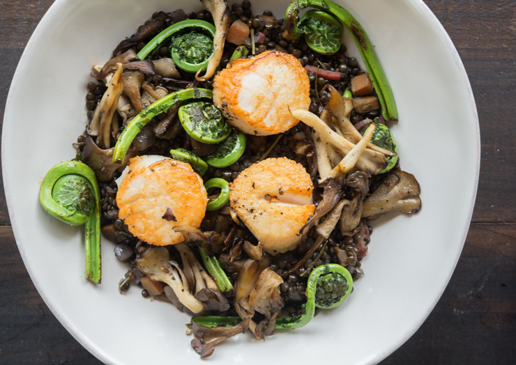 Putting it all together: Plate the lentils in each bowl, top with sauteed mushrooms, fiddleheads, and seared sea scallops or fish.