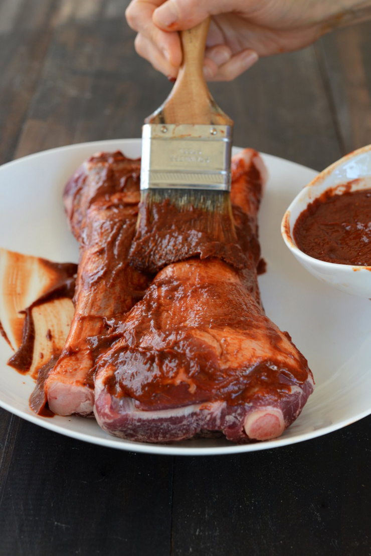 Making the Chile Paste: Drain the chiles and place in a blender jar with the garlic and vinegar. Pulverize the cumin and peppercorns in a mortar or spice grinder, and add to the blender along with the salt and ¾ cup water.  Blend until very smooth.  Strain the chile paste through a medium-mesh sieve.  Remove ½ cup of the paste, stir in the sugar to the reserved ½ cup, cover and set aside for the final glazing.  Spread the remaining chile paste over the meat, cover and refrigerate for at least 4 hours or, preferably, overnight.