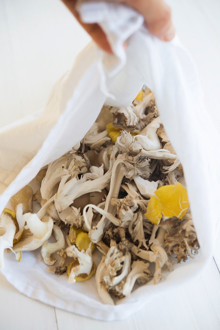 Sauteed a combination of yellow and grey oysters and maitake mushrooms in the compound butter, one batch in tarragon and shallot butter, the other in nori and toasted sesame butter.
