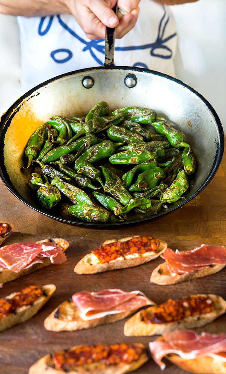For the tapa: Rub the grilled bread with a clove of garlic. Top with thin slices of chorizo or Serrano ham, and then a fried quail egg. Top with a pan-roasted Padrón and secure with a toothpick. Drizzle with a little extra virgin olive oil and sprinkle of smoked paprika. Enjoy while they’re hot.