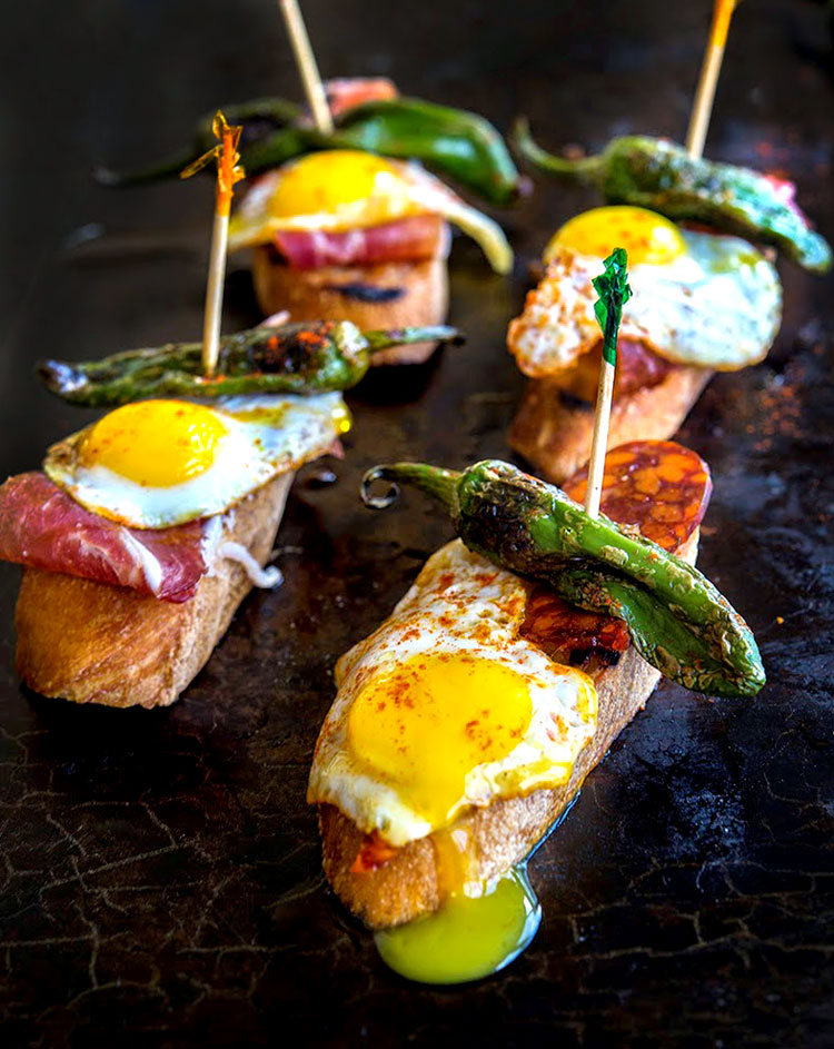 A Tapa of Chorizo or Serrano Ham, Quail Egg, and Padrón Peppers