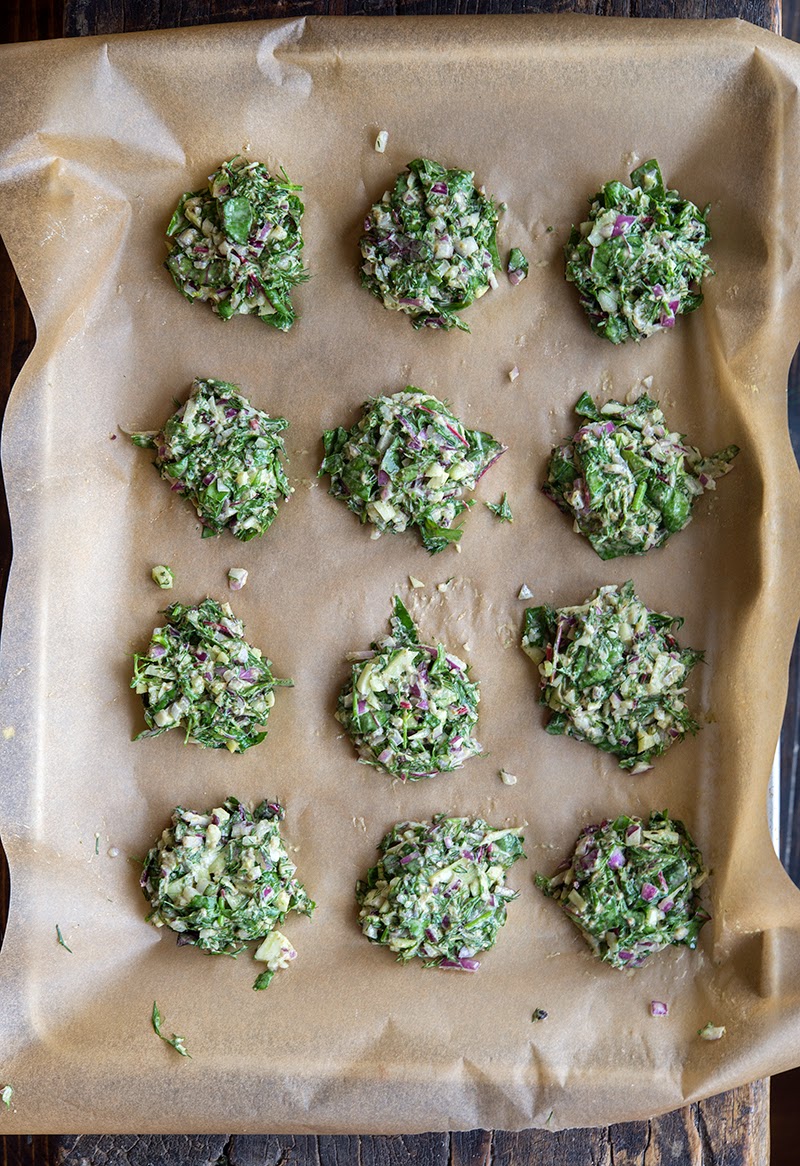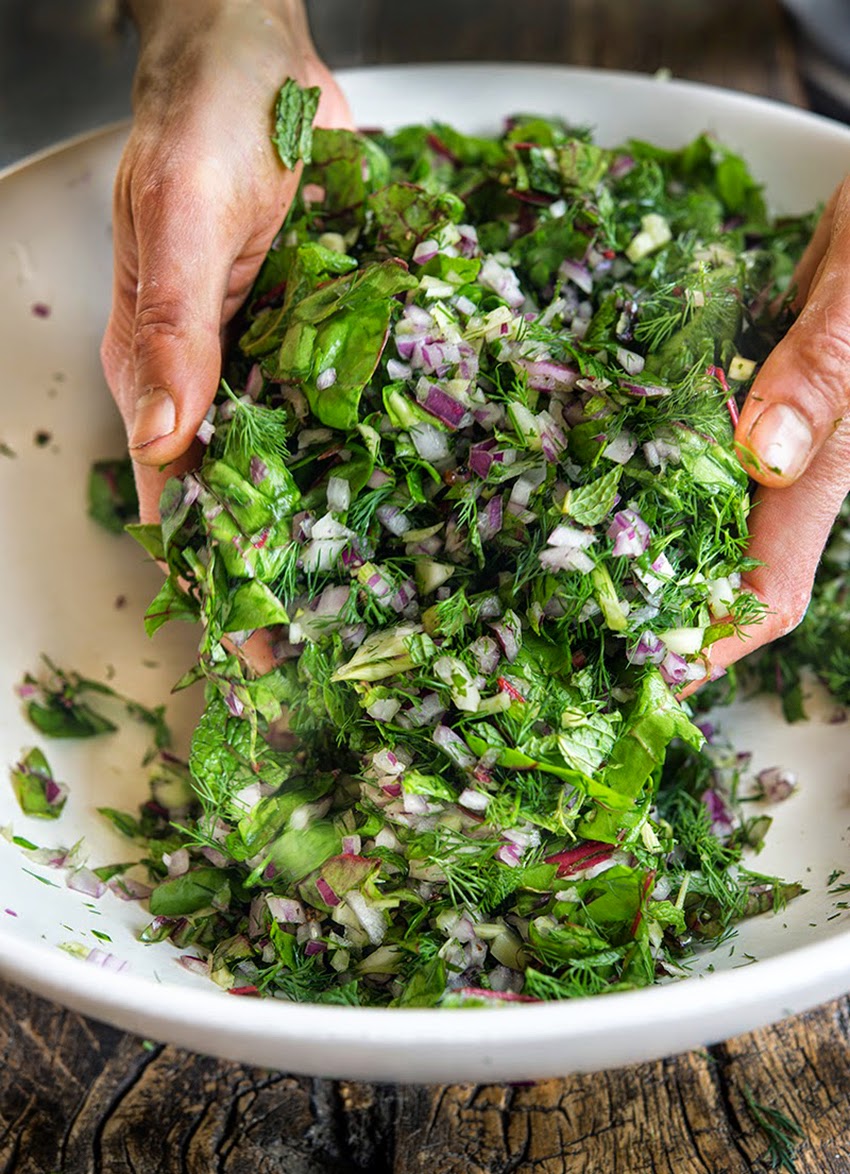 These pancakes are chock full of vegetables. There’s an assortment of greens in the form of swiss chard, fava bean greens (a new discovery of mine), and spinach (you can use any combination of hearty, leafy greens), along with fennel, onion, mint, and dill.