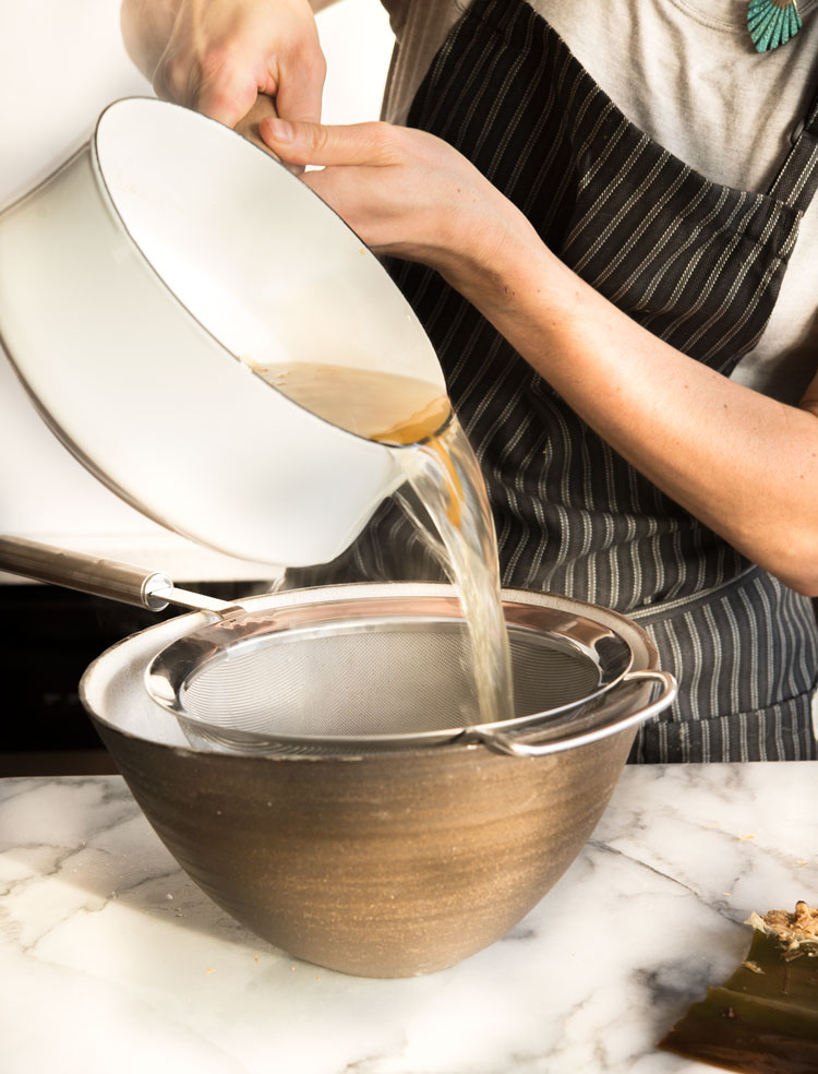 Steep the kombu in 4 cups of water over medium heat until the water comes to a rapid simmer (don’t let it come to a boil).