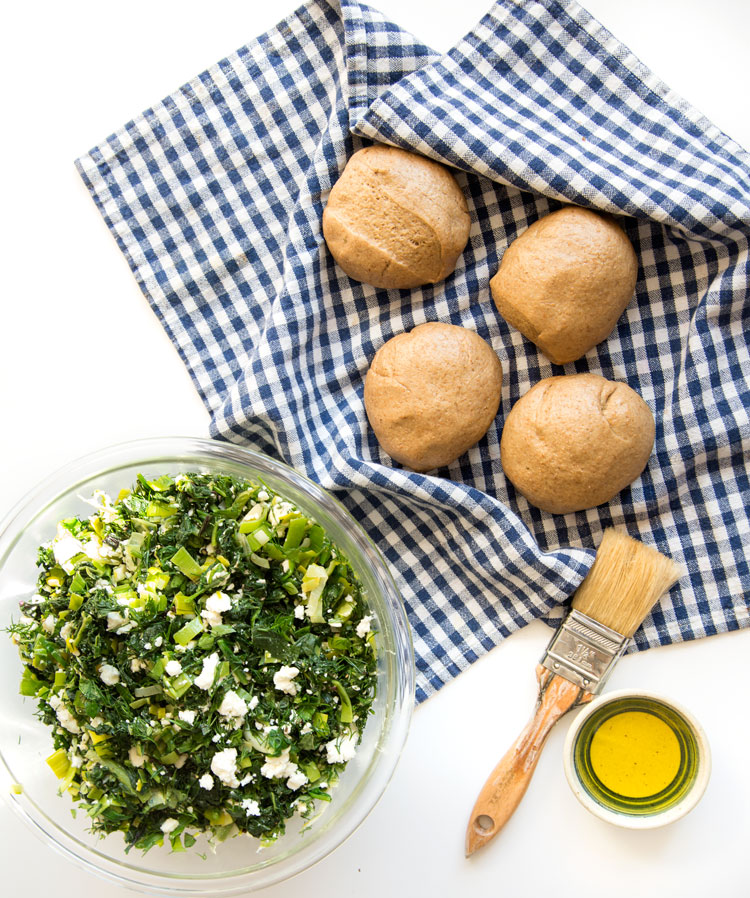 In a large bowl, combine the leeks, chopped greens, herbs, feta, and season with salt and pepper. Stir in 1/3 cup Greek olive oil, or more, as desired (I added a few more glugs of olive oil). Let the filling cool.