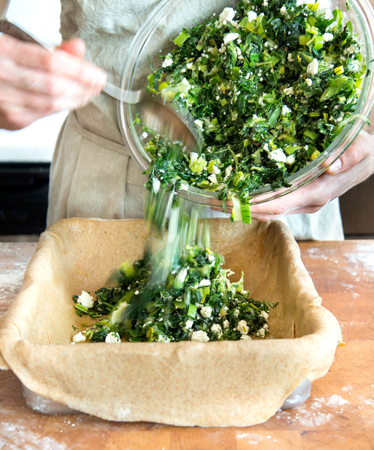 More often than not, when I order spanikopita, the ratio of filo [or phyllo] dough to greens is skewed in favor of the dough. Kind of disappointing if you ask me. I want my pie stuffed to the gills with greens. And I can’t recall ever encountering a savory Greek pie that contained a green other than spinach.