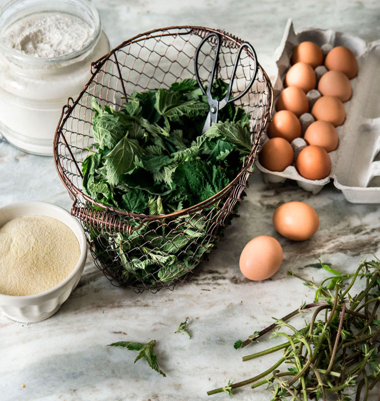 To prepare the stinging nettle: Pull the leaves off the stems. Discard the larger, tougher stems. I prefer to do this before blanching. Just be careful when handling, because the leaves do sting. You can also remove the larger tougher stems after they’re blanched. Bring a large pot of water to a boil. Blanch the stinging nettle by plunging them in the boiling water for 30 seconds to 1 minute. With a slotted spoon, transfer to an ice water bath. Drain the water, wringing out as much water as possible from the nettle leaves. Roughly chop. Blend the blanched nettle leaves in a high speed blender (or food processor) with the eggs until fairly smooth.
