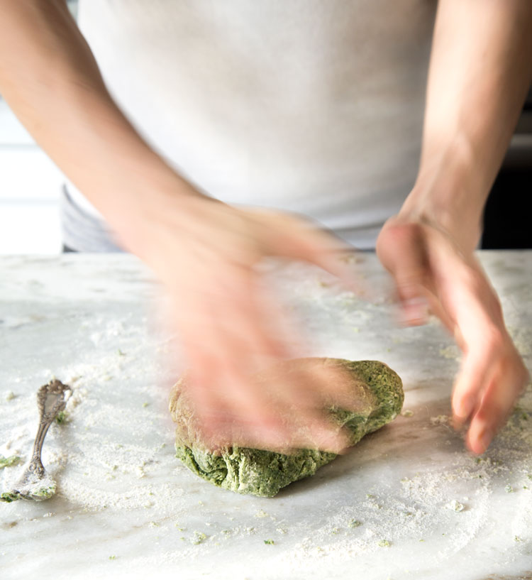 Combine the flours and salt. Mound the flour on a dry, clean work surface. Create a well in the middle. Add the nettle mixture to the well. With a fork, gently work the flour into the mixture. Start with the inner rim of the well and continue mixing in the flour until you have a solid mass.